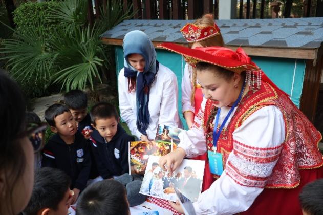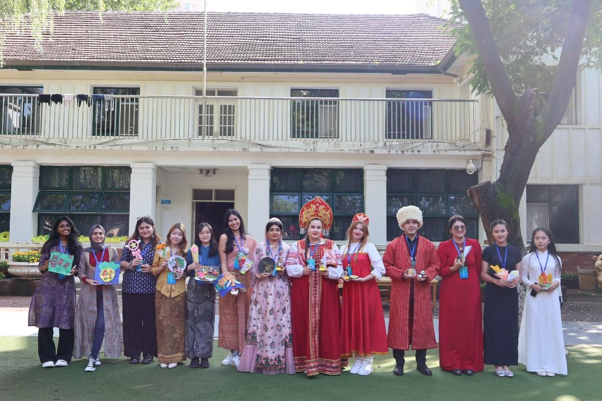 在俄罗斯展台,孩子们试戴了精美的花环头饰;在泰国展台,他们双手合十,模仿着“萨瓦迪卡”的问候姿势;在印度尼西亚展台,孩子们试穿着色彩斑斓的传统服饰;在缅甸展台,繁复华丽的手工艺品引得阵阵惊叹。