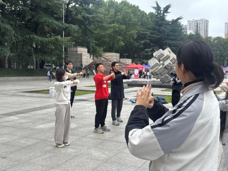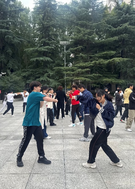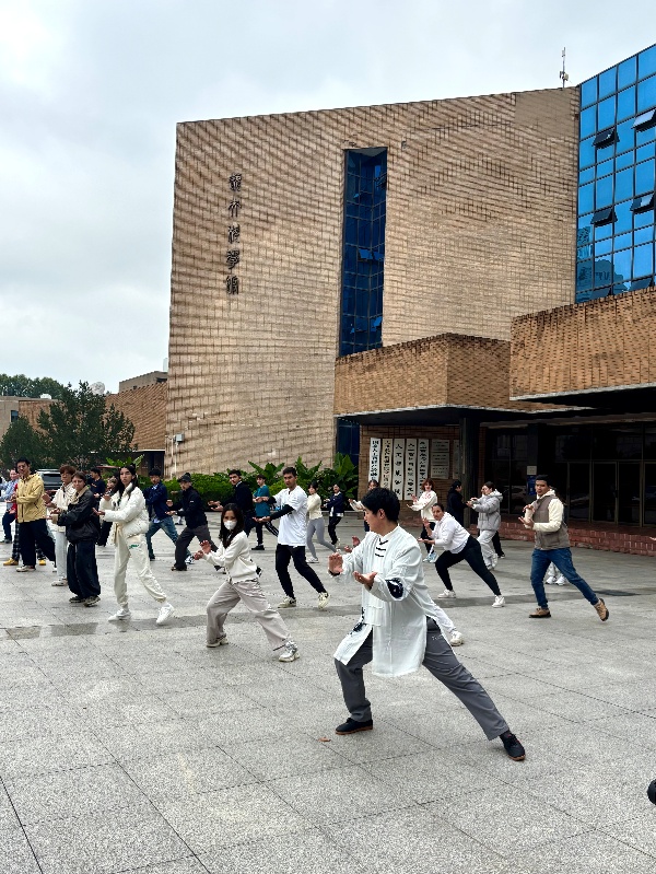然后,由武术协会的徐老师继续给同学们带来中国传统武术——太极的教学。徐老师由简入繁,从起势开始,给同学们讲解了以柔克刚的太极拳。在教学中,徐老师也介绍了太极的特点:缓慢松柔、意气体合一,通过圆滑、柔和的动作来化解和引导对方的力量。为了让教学更有趣,徐老师还传授了民间的顺口溜“一个大西瓜,一刀切两半,你一半,我一半”,有趣的教学风格让同学们在练习的同时也更乐在其中。