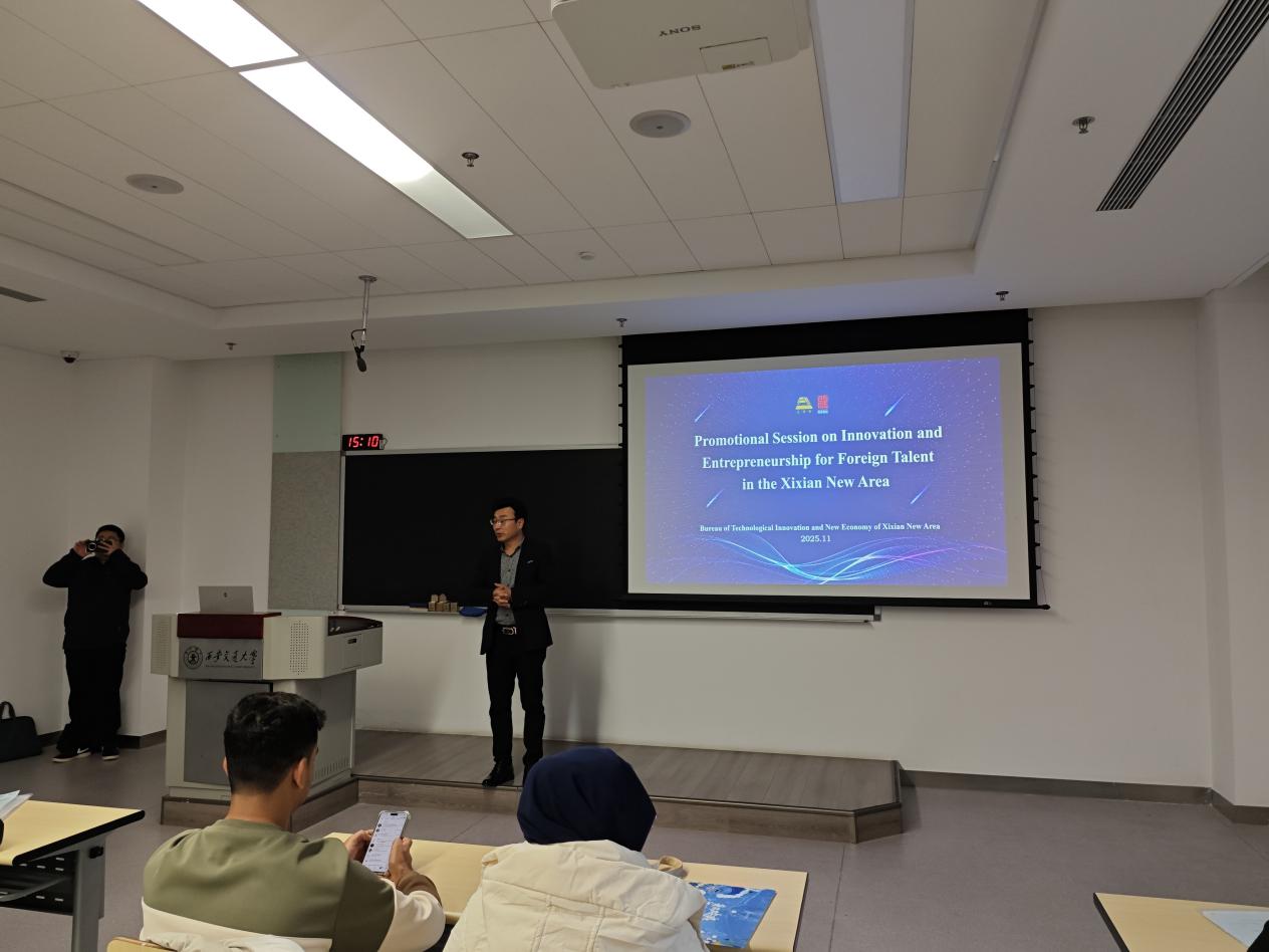 11月14日下午,由西咸新区科技创新和新经济局(秦创原创新驱动发展办公室)和我校国际教育学院共同举办的“西咸新区外籍人才创新创业宣讲会”在我校创新港校区成功举行。宣讲会吸引了百余名国际学生踊跃参与,现场气氛热烈,充分展现了我校国际学生群体关注中国发展、积极投身创新创业的热情。
