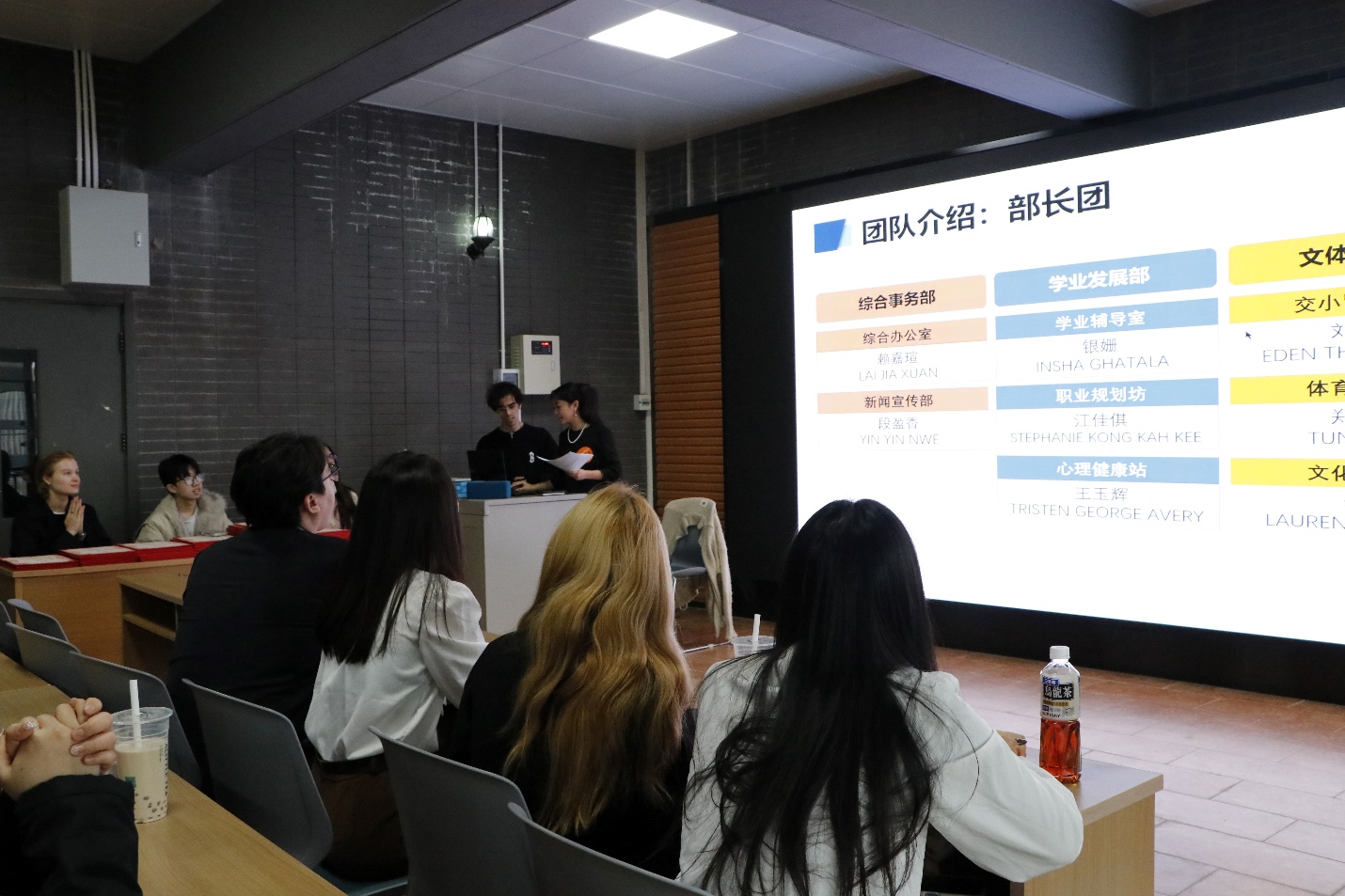 学业发展部丁云廷(HADJI OTMANE)介绍了部门概况。该部门由来自14个国家的17名成员组成,下设三个子部门:学业辅导室负责组织学业领航讲座与学业辅导团;职业规划坊开展简历、面试等技能培训;心理健康站计划举办瑜伽及医疗健康活动,关注学生身心健康。