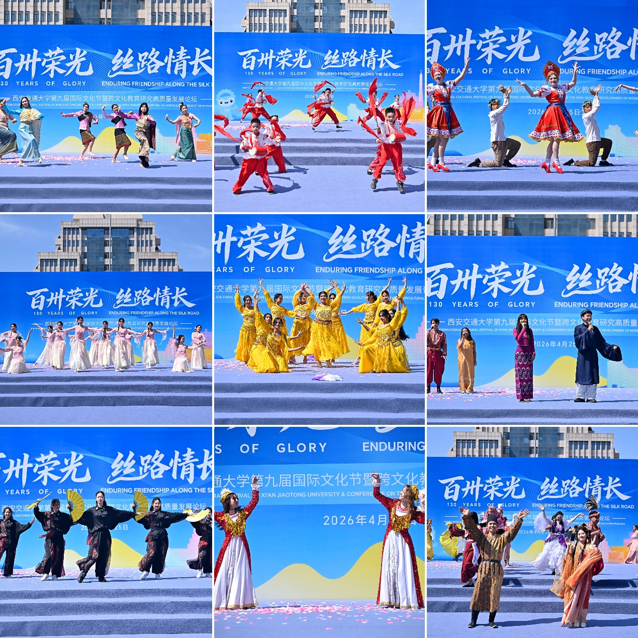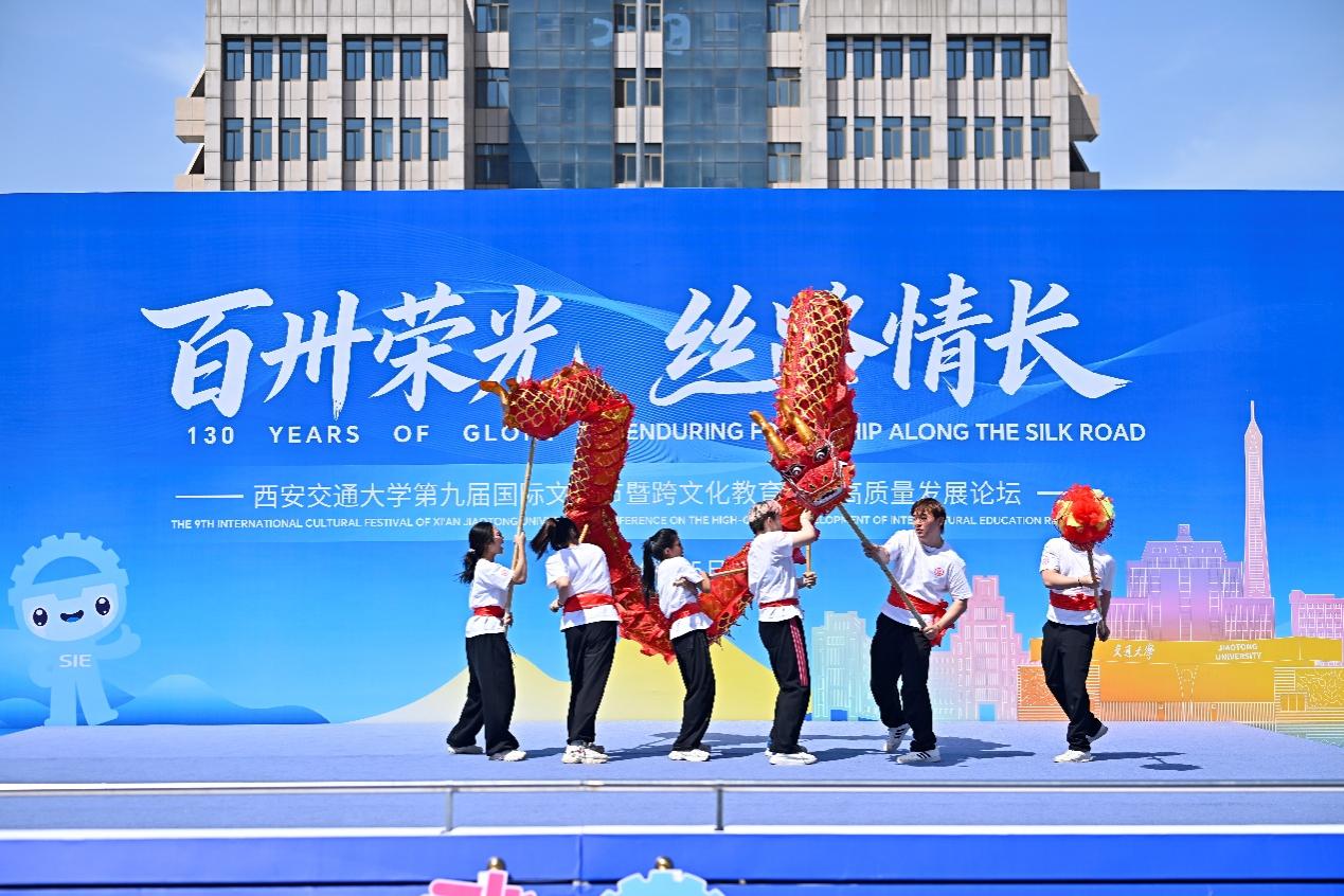 百卅荣光映丝路,多元文化谱新篇。4月25日,西安交通大学第九届国际文化节在兴庆校区四大发明广场隆重举行。本届文化节以“百卅荣光,丝路情长”为主题,庆祝建校130周年暨西迁70周年。西安交通大学党委常委、副校长单智伟,国家留学基金委原副秘书长王胜刚,陕西省人民政府外事办公室副主任高进孝,以及来自各兄弟高校、企事业单位和校内各部门代表等出席开幕式。来自全球130余个国家和地区的千余名中外师生齐聚一堂,共同呈现了一场跨越国界、交融共生的文化盛宴。本届文化节由西安交通大学国际教育学院主办,党委宣传部、校团委、保卫处协办。