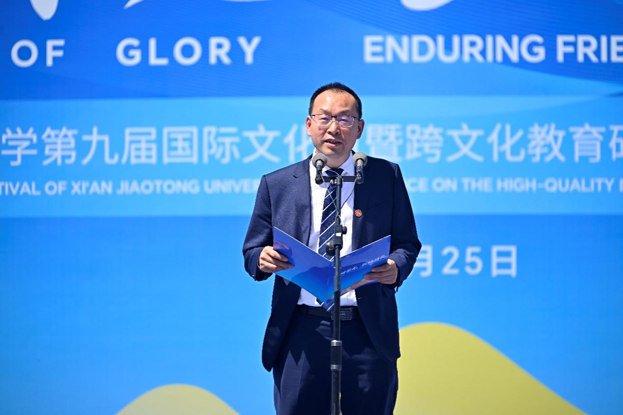 陕西省人民政府外事办公室副主任高进孝在致辞中表示,本届文化节以文化牵线,以青春聚力,为深化中外友好交往构筑了坚实的民心根基。他提到,高等教育的国际交流与合作是推动学术卓越与国家发展的关键引擎,西安交通大学作为我国高等教育的领军者之一,搭建了高水平国际合作平台。他勉励国际学生珍惜在陕求学时光,成为联通中外、促进互利共赢的友好使者。