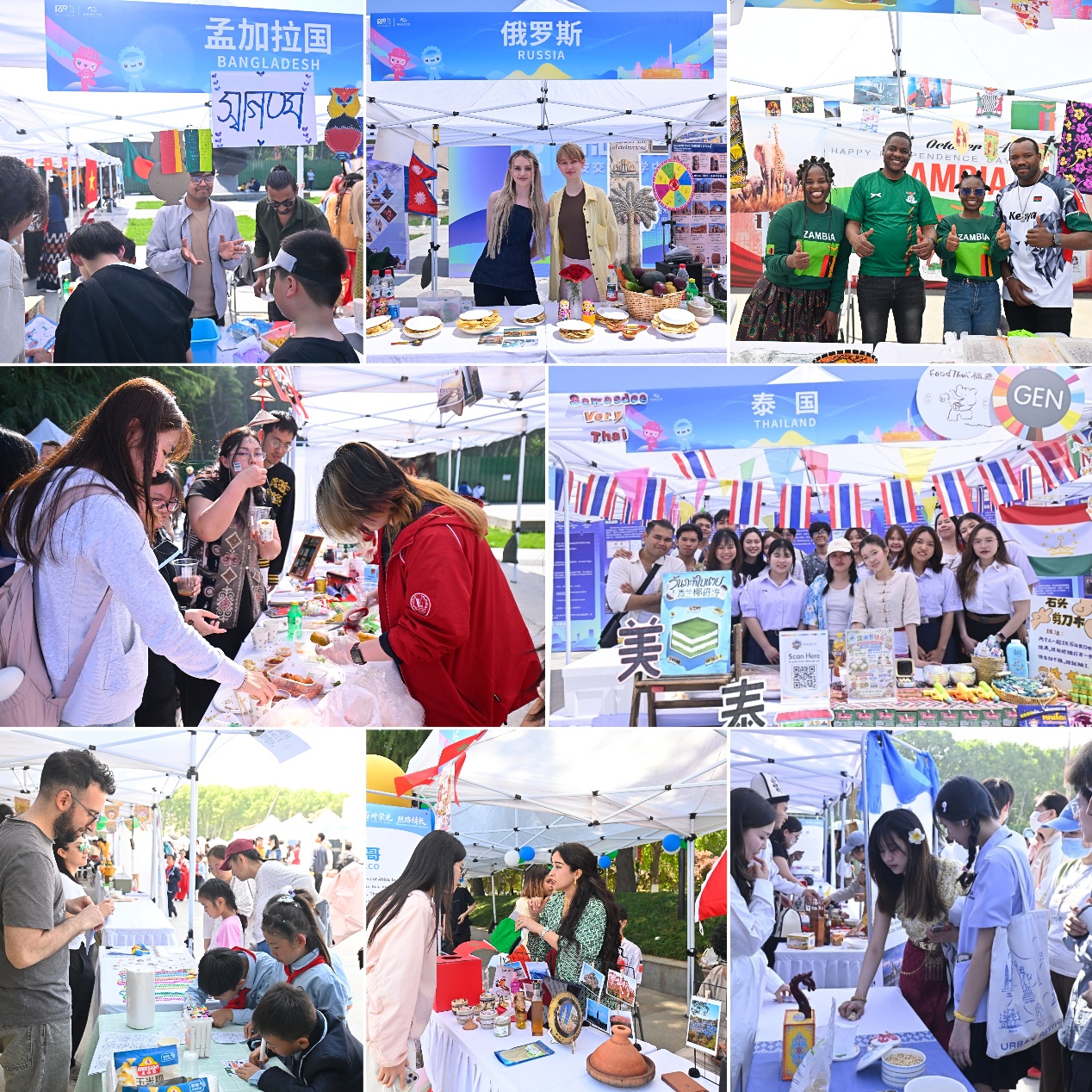 舞台下,来自44个国家的文化展位依次排开,身着各国传统服饰的国际学生热情分享本国的风土人情、历史文化和特色美食。哈萨克斯坦的传统刺绣与服饰精巧别致,泰国的美食与热带风情令人流连,墨西哥的手工艺品色彩斑斓,俄罗斯的民俗舞蹈别具一格,赞比亚的木雕与鼓点传递着草原的律动,印度的香料与纱丽绚烂夺目,摩洛哥的咖啡与薄荷茶香气弥漫。中外师生手持文化节路书,在各个展位间穿梭游览,仿佛完成了一次环游世界的文化之旅。