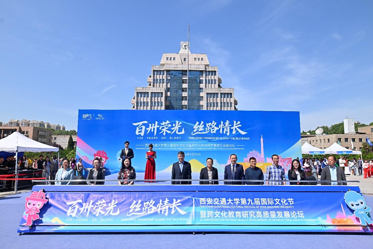 单智伟、王胜刚、高进孝等嘉宾共同推动象征着多元文化交融与丝路友谊传承的启动轴,西安交通大学第九届国际文化节正式开幕。