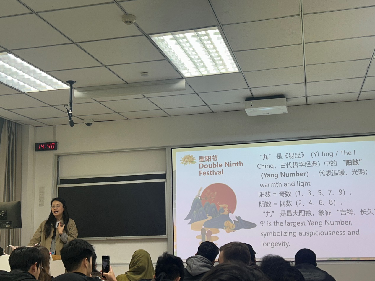 从重阳节的历史渊源、神话传说到各地不同的民俗活动、特色美食,从名人诗赋、重阳谚语到尊老爱老、感恩先祖,刘莹老师在生动详实的讲述中巧妙穿插视频、音频等多媒体资源,激发了国际学生对重阳佳节的浓厚兴趣。作为汉语教师,刘莹老师还重点讲授了重阳节相关的汉语词汇,扩大国际学生词汇量的同时,也增强了同学们的汉语学习意识。